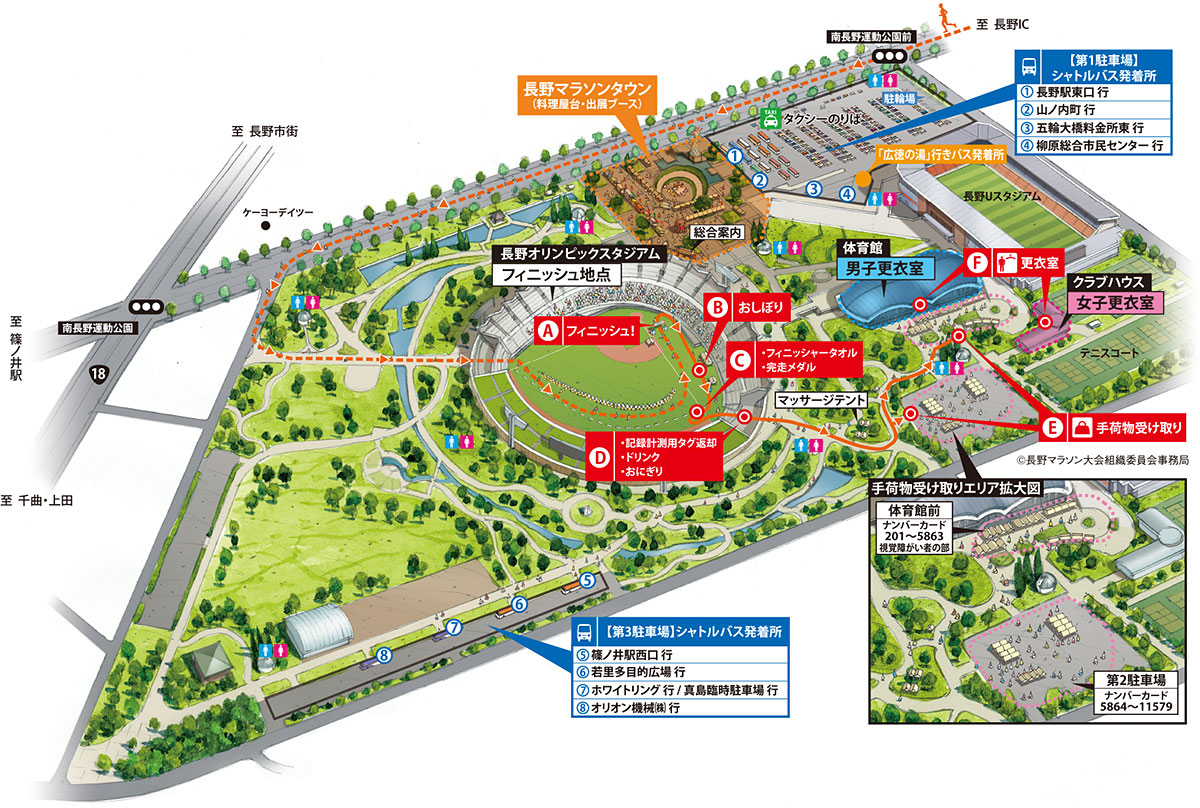 フィニッシュ会場から長野駅東口行きのシャトルバスをご利用ください。長野駅善光寺口からすぐです。 |