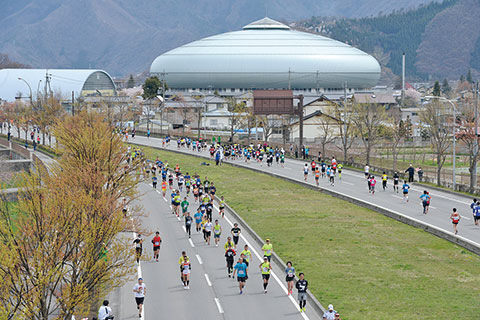 堤防道路を左折すると残り3km地点。典厩寺入口交差点を左折して一般道に入ると、フィニッシュの長野オリンピックスタジアムまでは一直線です。沿道には店舗、住宅が立ち並び、市民の応援が最終盤の走りを後押しし、スタジアムに入ると多くの観衆やボランティアが拍手で迎えてくれます。笑顔でフィニッシュを飾ってください。