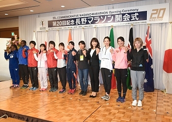 第20回記念長野マラソン(日本オリンピック委員会、日本陸連、長野県、長野市、信濃毎日新聞社主催、NHK、長野オリンピック・パラリンピック20周年記念事業実行委員会共催)の開会式は14日、国内外の招待選手や大会役員ら約350人が出席し、長野市内のホテルで行われた。