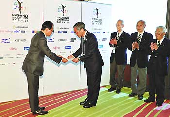東京五輪マラソン代表選考会「グランドチャンピオンシップ(MGC)」の出場権が懸かるレースでもあり、小坂大会長は「新たな元号『令和』へとつなぐ貴重で大切な大会。東京五輪に向け、駆け上がる選手が現れてほしい」と期待。内山村長は「MGCに出場する選手が誕生し、一般ランナーには完走率を上げてもらえるように努めたい」と決意を述べた。