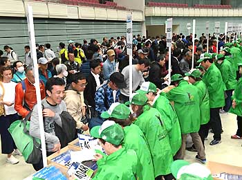 第21回長野マラソンの選手受け付けで、ナンバーカードなどを受け取るランナーたち=20日午前9時57分、長野市若里のビッグハット