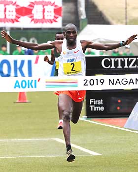 男子で初優勝したジャクソン・キプロプ(ウガンダ)=21日、長野市の長野オリンピックスタジアム