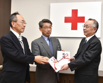 長野マラソン実行委員長の樋口博・長野市副市長=写真中央=と、同社の畑谷広治・専務取締役営業部門担当=同左=が同支部で清水深事務局長=同右=に目録を手渡した。清水事務局長は「災害を想定した資材の調達や救護者訓練の費用に役立てたい」と話した。