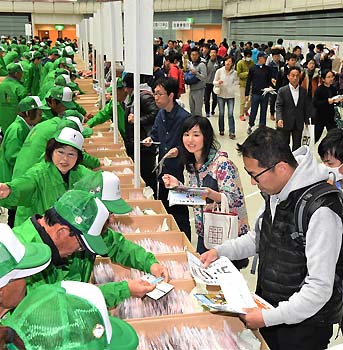 受け付け開始は午前10時を予定していたが、開始時刻前から長い列ができ15分早めた。山梨県南アルプス市の会社員、小池謙二さん(40)は、昨年10月に松本市で開いた第1回松本マラソンに続いて2回目のフルマラソン。「雨予報で少しテンションが下がったが、景色を楽しみながらゆっくり走りたい」と期待した。