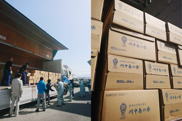 長野マラソンの給水所で提供する、長野県企業局製造の「川中島の水」が、3/30大会に向けて搬出されました。企業局の皆さんのバケツリレー方式での積み込み作業で、大型トラックに積まれていきました。「川中島の水」は地下約100mから汲み上げられた、信州の山々が育んだ自然の恵みです。給水所では、ぜひ「川中島の水」で力を蓄えてください!!