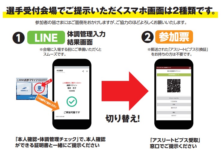 長野マラソンの選手受け付け会場で皆さまにご提示いただくスマホ画面は以下の2種類ございます。