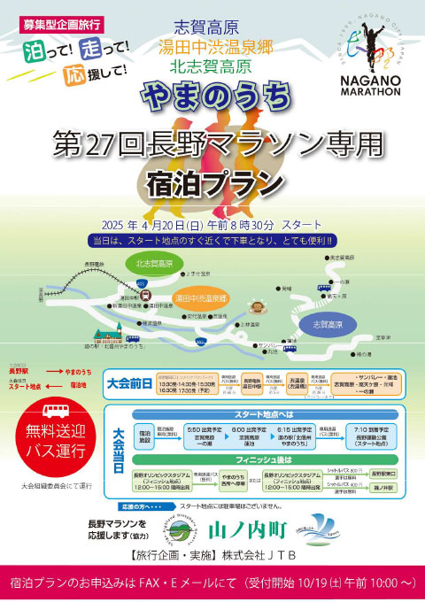 ※例年は各資料とともに「長野マラソン専用宿泊プラン:やまのうち」のチラシを郵送しておりましたが、今回は郵送はございません。お客様ご自身でチラシをダウンロード、印刷の上、お申込みください。