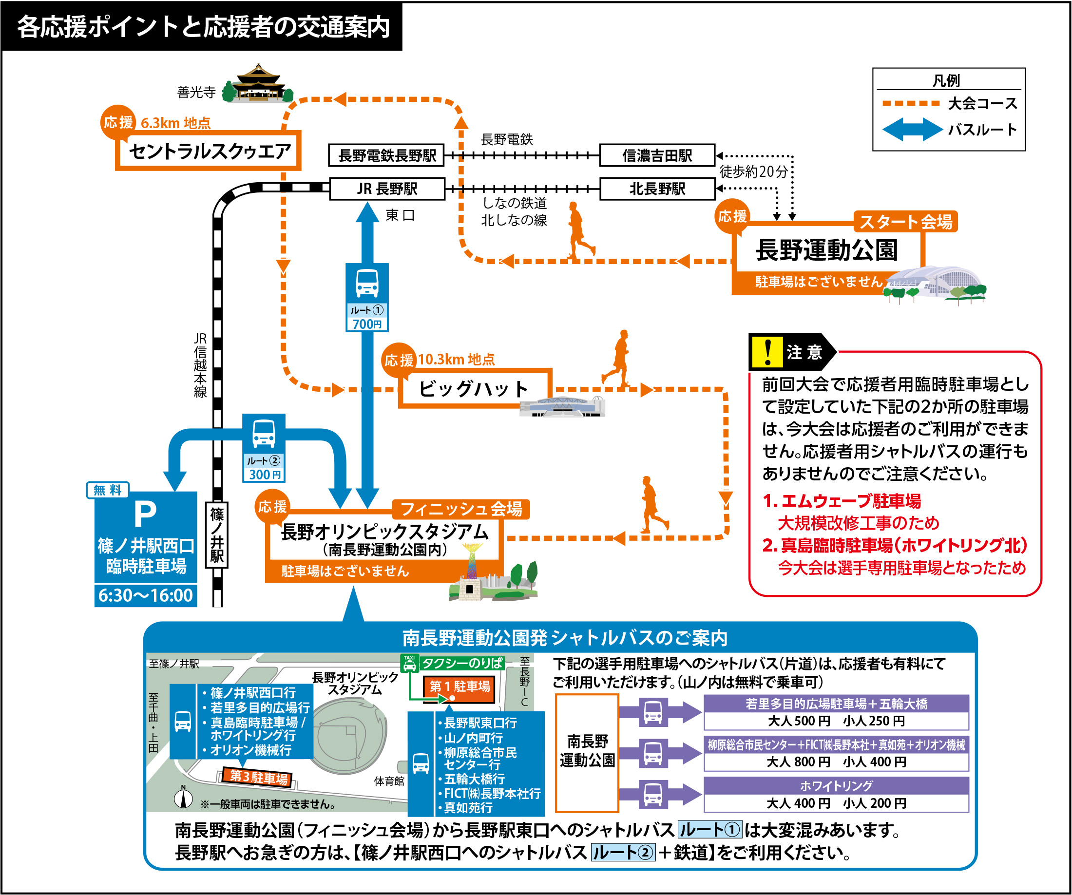 - スタート会場(長野運動公園)、フィニッシュ会場(南長野運動公園)に、選手用駐車場・応援者用駐車場はございません。公共交通機関、または応援者用の臨時駐車場から徒歩・バスなどでお越しください。
