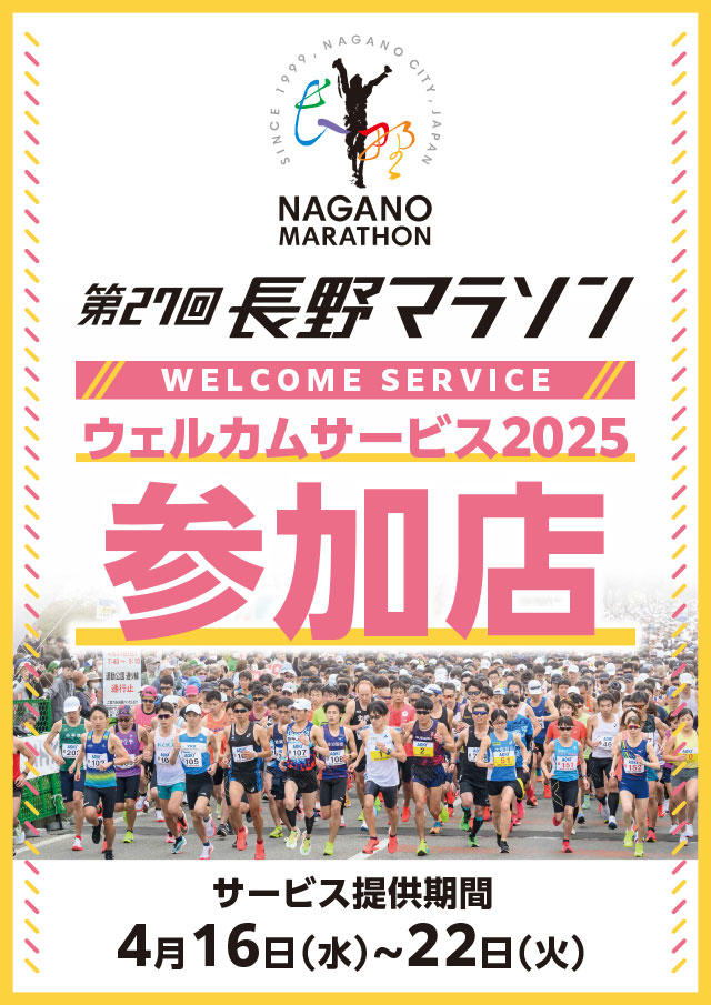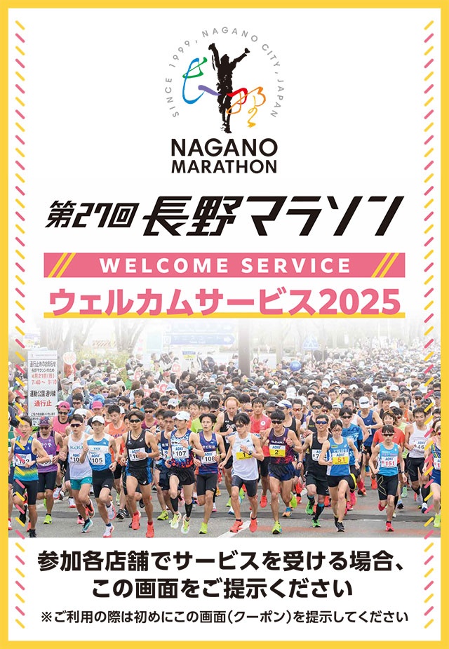長野マラソン参加ランナー、ボランティア、応援する市民の皆さまに、地元の飲食店やお店をご利用いただいて、長野市をより楽しんでいただく特別企画「長野マラソンウェルカムサービス2025」