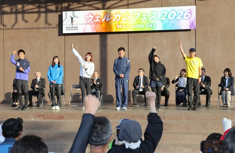 歓迎イベントも開かれた会場には、多くの市民ランナーが集まった。大会長の小坂壮太郎・信濃毎日新聞社社長は「この日のために厳しい練習を積み重ねてきたと思う。その成果を発揮して春の信濃路を駆け抜けてほしい」とランナーを激励した。
