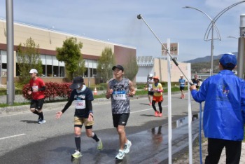 簡易シャワーはコース中盤以降の4カ所に設置。終盤の40・1キロ地点では、補助員を務める長野高専(長野市)の学生3人が、走り抜けるランナーの頭上から水をかけた。水を浴びたランナーは「気持ちいい」と叫んでいた。